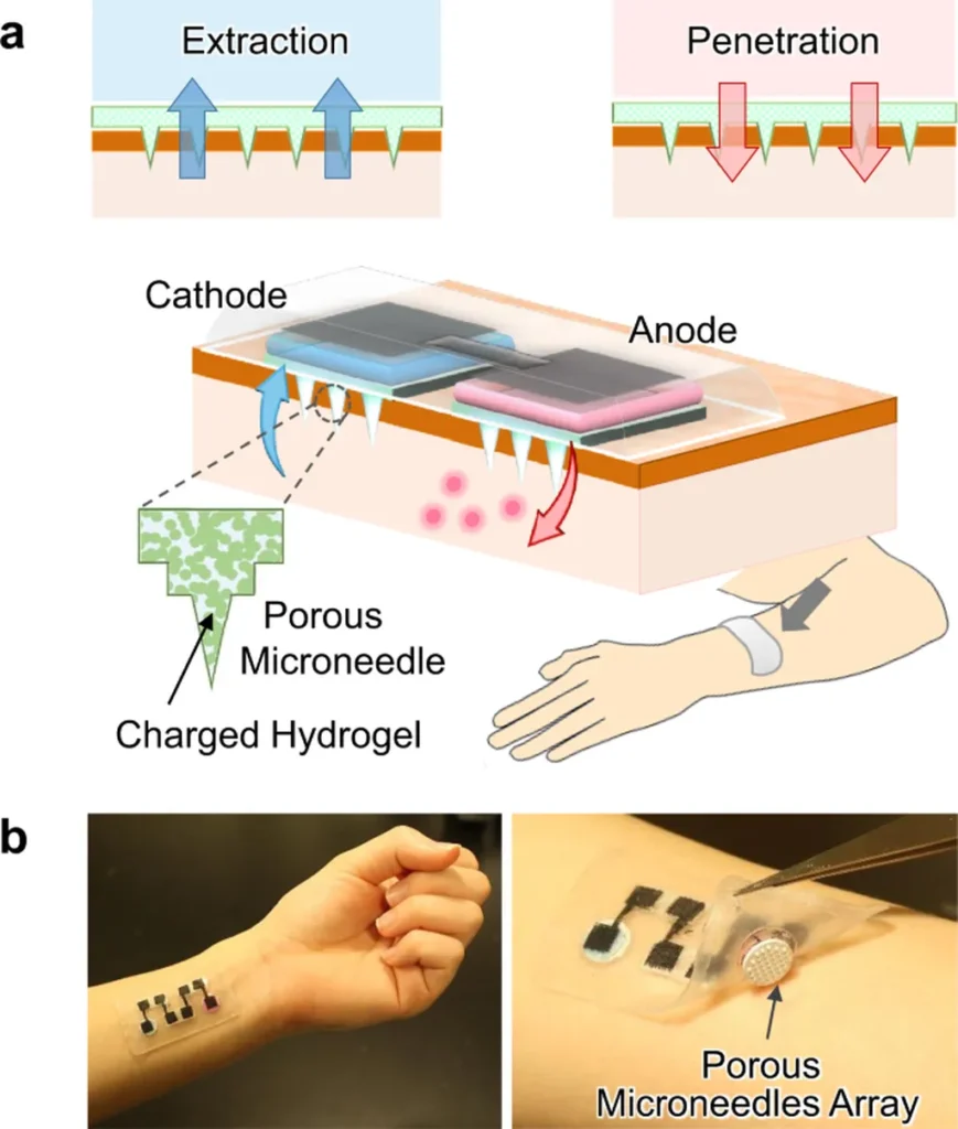 The study systematically explores the mechanisms behind Ebio-MNs, highlighting their potential in various medical applications. For instance, in diabetes management, these microneedles can monitor glucose levels and deliver insulin as needed, offering a seamless and automated approach to disease management. Similarly, in chronic wound repair, Ebio-MNs facilitate electrostimulation-enhanced healing, accelerating tissue regeneration and reducing recovery times.